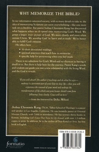 Why memorize the Bible? In our information-saturated society, with so many details to take in, the idea of memorizing Scripture can seem overwhelming–like one more task on a checklist. But pastor Joshua Choonmin Kang has discovered what happens when we do spend time memorizing God's Word: we grasp a larger, truer picture of God. We more closely and more often imitate Christ. We worship God "in Spirit and in truth." We're better able to fulfill God's mission. However, Pastor Kang also knows that memorizing Scripture isn't easy. The process itself, like the transformation it brings, doesn't happen overnight. Scripture by Heart is therefore his help for your growth in this important practice. He offers here