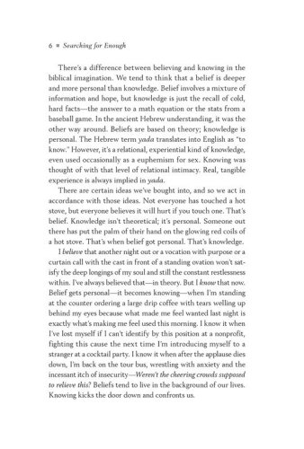 A unique and validating look at the tension you feel between disillusionment and a desire for truth, Searching for Enough helps you see your doubt not as an emotion to fear but as an invitation to be followed.