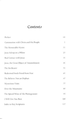 Twelve sermons include:Communion with Christ and His PeopleThe Memorable Hymn Jesus Asleep on a Pillow Real Contact with Jesus Jesus, the Great Object of Astonishment The Sin-Bearer Redeemed Souls Freed from Fear The Believer Not an Orphan Mysterious Visits Over the Mountains The Spiced Wine of the Pomegranate I Will Give You Rest
