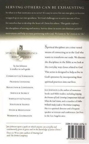 A Formatio book. Serving others can be exhausting. So what is it that motivates you to serve? It's easy to serve for your own glory–to become wrapped up in your own goodness. Yet God challenges you to serve not out of love for yourself but to develop a Christlike love for others. In this Bible study guide, Jan Johnson covers the disciplines of service and secrecy. Going deeper in these areas will help you to avoid prideful motivations and to enjoy partnering with God. You learn to "be" even as you "do."