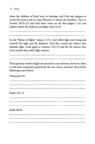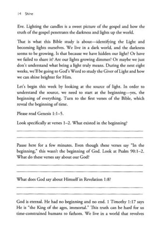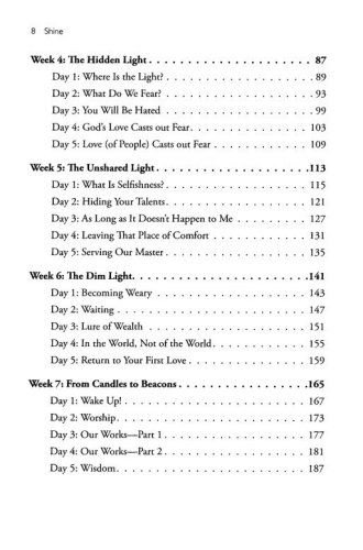 The truth is that it's in us. As said in Matthew 5:14, “You are the light of the world.” Shine is an eight-week study into this truth—into identifying the One True Light and learning how to shine brighter for Him. God's light reveals truth, draws others, and exposes sin, and our own light works to do the same. However, it is not so easy because it's a fight against fear, selfishness, apathy, and the harmful impulse to hide one's personal light.