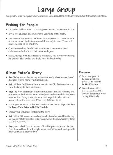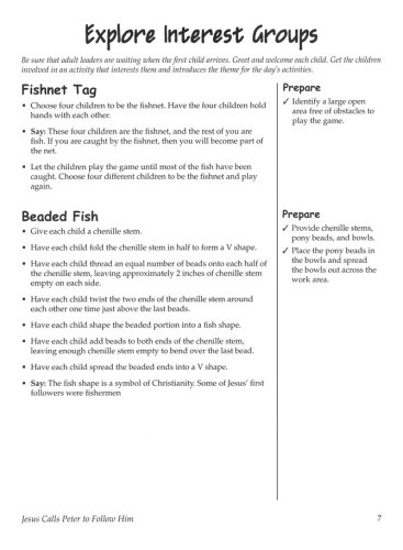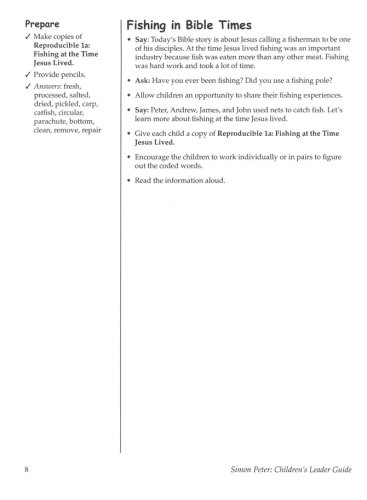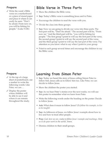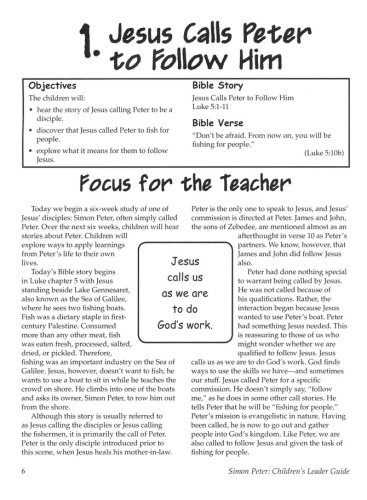The Call of Simon the Fisherman Walking with Jesus in the Storm Bedrock or Stumbling Block? "I Will Not Deny You" From Cowardice to Courage The Rest of the Story The Children’s Leader Guide contains session plans for younger and older children (grades K-2 and 3-6) including games, activities, craft ideas, and reproducible handouts.