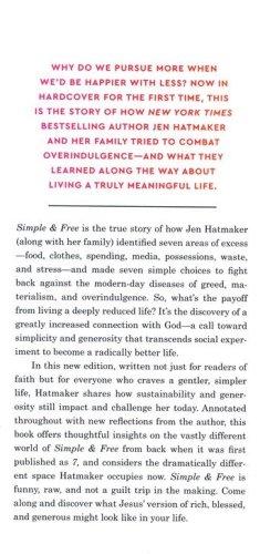 In this new edition, written not just for readers of faith but for everyone who craves a gentler, simpler life, Hatmaker shares how sustainability and generosity still impact and challenge her today. Annotated throughout with new reflections from the author, this book offers thoughtful insights on the vastly different world of Simple & Free from back when it was first published as 7, and considers the dramatically different space Hatmaker occupies now. Simple & Free is funny, raw, and not a guilt trip in the making. Come along and discover what Jesus’ version of rich, blessed, and generous might look like in your life.