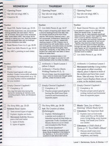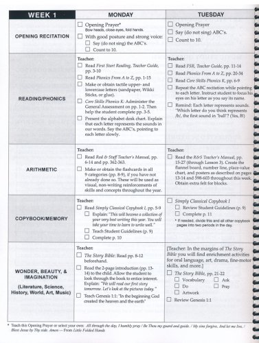 The lesson plans are broken up into individual tasks for each subject for each day. For example, on Monday of Week 5, assignments are given for the subjects of reading/phonics, arithmetic, copybook/memory, and wonder/beauty/imagination (literature, science ,history, world, art, and music). Each task has a checkbox to easily keep track of which assignments were completed.