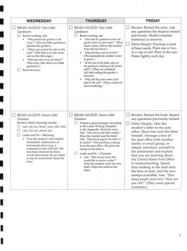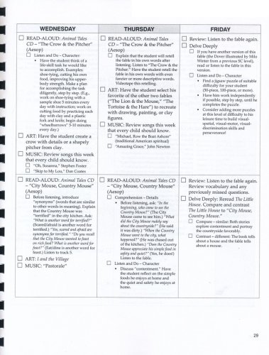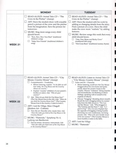 This set of wonder, beauty, and imagination lesson plans (covering literature, science, history, geography, world, art, and music) organizes tasks in an easy-to-follow grid-box layout. Individual boxes cover Monday-Friday for each of the 34 weeks covered by this lesson plan, with assignments and checkboxes included in the daily list. An 8-week summer review also included.