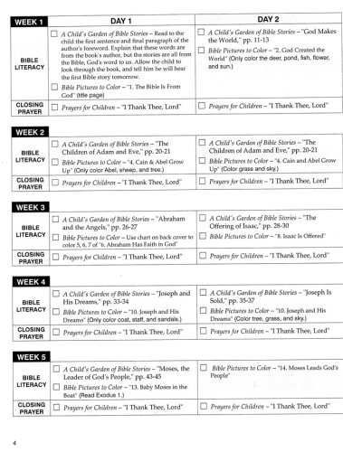 This set of lesson plans is taken from the full Level B Curriculum Manual (sold-separately), which contains a full-year of lesson plans that include multiple subjects, including these assignments. This lesson plan guide includes the Bible Literacy assignments given each week. These exercises introduce children to the true stories of God, and help to cultivate faith and pass on the right literature of Western Civilization. Weekly four-day plans are provided; assignments have accompanying checkboxes to keep everyone on track. An 8-week review is also included.