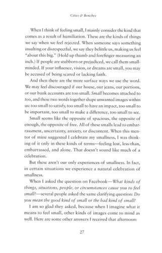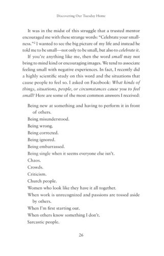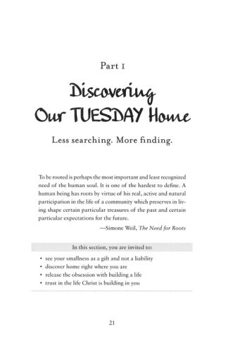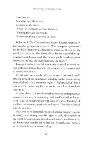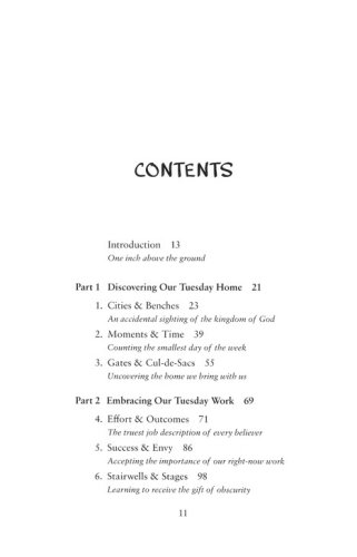 Our obsession with bigger and faster is spinning us out of control. We move through the week breathless and bustling, just trying to keep up while longing to slow down. But real life happens in the small moments, the kind we find on Tuesday, the most ordinary day of the week. Tuesday carries moments we want to hold onto–as well as ones we'd rather leave behind. It holds secrets we can't see in a hurry–secrets not just for our schedules but for our souls. It offers us a simple bench on which to sit, observe, and share our stories.