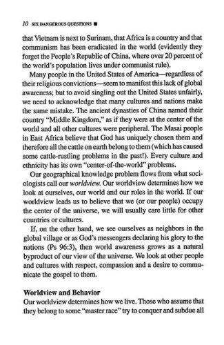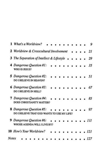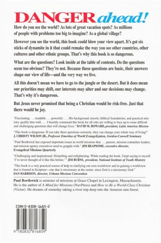 How do you see the world? As lots of great vacation spots? As millions of people with problems too big to imagine? Missionary Paul Borthwick just might expand your view–or even explode it. He asks six dynamite questions that challenge you to look more closely at other countries, other cultures, other ethnic groups and other ways of acting on your faith. Dangerous Question #1: Who Is Jesus? Dangerous Question #2: Do I Believe in Heaven? Dangerous Question #3: Do I Believe in Hell? Dangerous Question #4: Does Christianity Matter? Dangerous Question #5: Do I Believe That God Wants to Use My Life? Dangerous Question #6: Whose Agenda Will I Live By? Don't be fooled. Borthwick's questions may seem obvious. But have you really thought about your answers to them before? Have you thought through how your answers are connected to work, family, money, friends, or education? Don't panic. Answering the questions Borthwick poses won't result in your immediate departure for the jungle or the desert–probably. But answering will very likely cause you to reorder your priorities, refocus your interests and even change your everyday choices: what to read, what to buy, what to do over the weekend. That's why reading this book is dangerous. But, then, Jesus never promised that following him would be risk-free. Only that there would be joy.