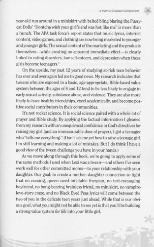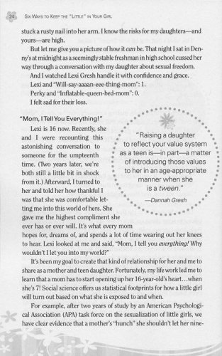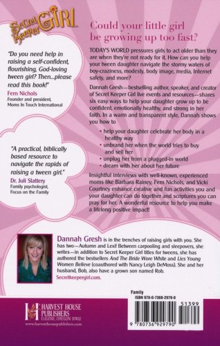 Studies show that the foundation for an emotionally healthy teen girl is built between the ages of 8-12 and that a good relationship with mom is one of the most important factors. So when the world wants girls to grow up too fast, how does a mother help her young daughter navigate the stormy waters of boy-craziness, modesty and body image, media, Internet safety, and more? With a warm, transparent style, Dannah Gresh shares six ways a mom can help protect and guide her daughter, including: