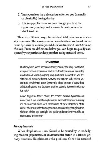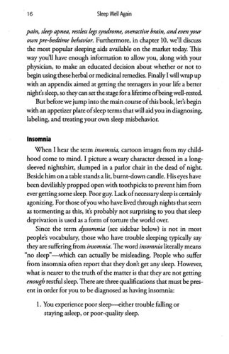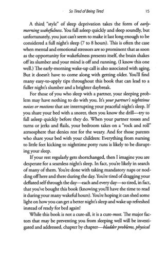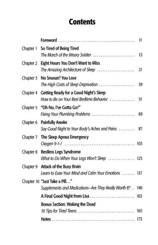 the high cost of sleep deprivationhow to prepare for a good night's sleepways to deal with middle-of-the-night "plumbing problems"whether medication will helphow to calm an overactive brainhow to deal with pain, sleep apnea, and restless leg syndrome