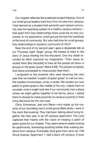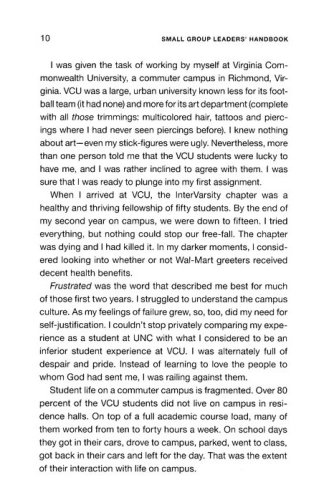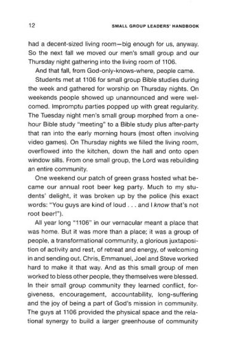 What do we mean when we talk about small groups? And more importantly: what do we expect to happen when people gather in this way? The small group that wrote this book—made up of current and former campus ministry professionals with InterVarsity Christian Fellowship—sees a small group as: a community that studies the Bible, prays and participates in God's mission together for the purposes of God's transforming work. Small groups are about transformation, and in this book transformation is given flesh and blood in the faces and names of the people you lead.
