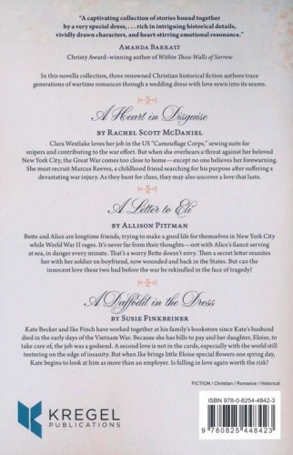 One perfect dress_three different love stories In this brand-new novella collection, three renowned Christian historical fiction authors trace generations of wartime romances through a special wedding dress with love sewn into its seams. "A Heart in Disguise" by Rachel Scott McDaniel Clara Westlake loves her job as a seamstress in the US "Camouflage Corps," sewing suits for snipers and contributing to the war effort. But when she overhears a threat against her beloved New York City, the Great War comes too close to home–except no one believes her forewarning. She must recruit Marcus Reeves, a childhood friend searching for his purpose after suffering a devastating war injury. As they search for answers together, they may also uncover a love that lasts. "A Letter to Eli" by Allison Pittman Bette and Alice are lifelong friends, trying to make a good life for themselves in New York City while World War II rages. It's never far away from their thoughts–not with Alice's fiance serving at sea, in danger every minute. That's a worry Bette doesn't envy. Then a secret letter reunites her with her soldier ex-boyfriend, now wounded and back in the States. But can the innocent love these two had before the war be rekindled in the face of tragedy? "A Daffodil in the Dress" by Susie Finkbeiner Kate Becker and Ike Finch have worked together at his family's bookstore since Kate's husband died in the early days of the Vietnam War. She has her daughter, Eloise, to take care of and bills to pay, and this job was a godsend. A second love is not in the cards, especially not with the world still teetering on the edge of insanity. But when Ike brings little Eloise special flowers one spring day, Kate begins to look at him as more than an employer. Is falling in love again worth the risk?