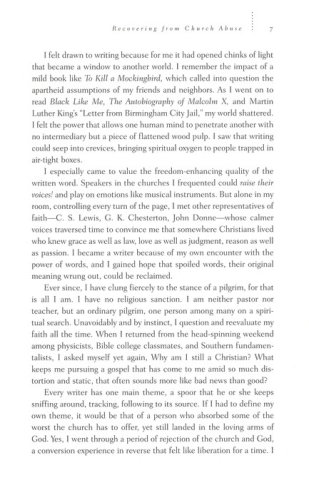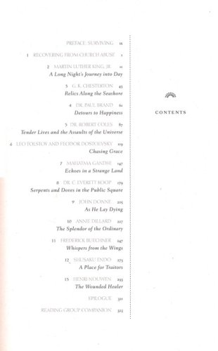 Yancey interweaves his own journey with fascinating stories of those who modeled for him a life-enhancing rather than a life-constricting faith: Dr. Paul Brand, G. K. Chesterton, Annie Dillard, Frederick Buechner, C. Everett Koop, Leo Tolstoy, Fyodor Dostoevsky, Henri Nouwen, John Donne, Mahatma Gandi, Shusaku Endo, Martin Luther King, Jr., Robert COles.