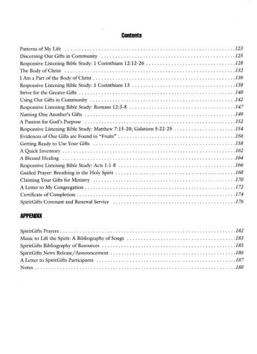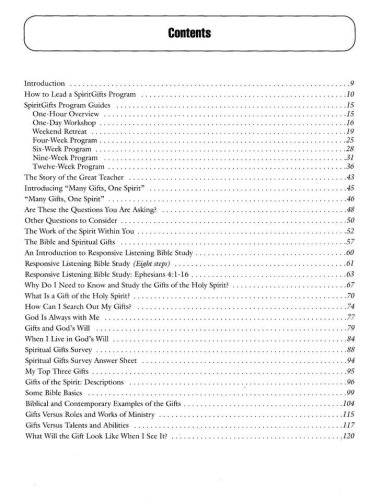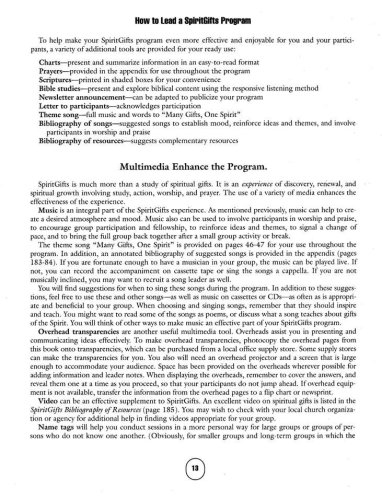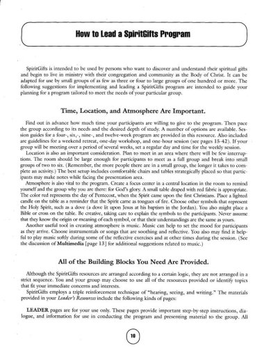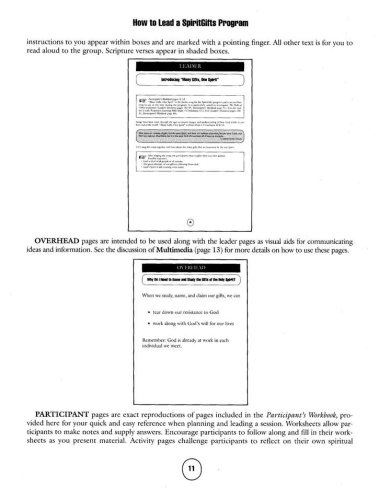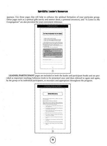 SpiritGifts is a dynamic group experience that builds community as participants share together in study, reflective exercises, discussion, worship, prayer, music, and group activities. The Leader's Resource includes: program helps, session guides, teaching/presentation pages, charts, spiritual gifts survey answer sheet, definitions of spiritual gifts, prayers, promotional materials and more. Leaders choose the 4-12 week approach or weekend option. (separate Participant's Workbook #008581)