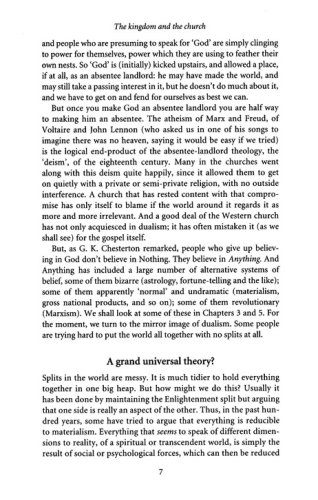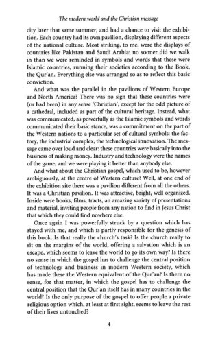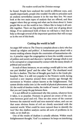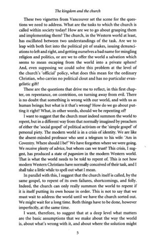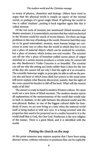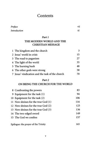 He concludes this prophetic book with a call to contemporary Christians to make a clear choice: "Are we to compromise with paganism, to assimilate, to water down the distinctives of Christian faith in order to make it more palatable? Are we to retreat into dualism, into a private 'spiritual' religion which will assure us of an other-worldly salvation but which will leave the powers of the present world unchallenged? Or are we to worship the God who is Father, Son and Spirit, and to find in that worship a renewed courage, a renewed sense of direction, and a renewed hope for the future?"