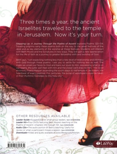 Stepping Up: A Journey Through the Psalms of Ascent – Bible Study Book by Beth Moore provides a personal study experience five days a week plus viewer guides for the group video sessions of this in-depth women's Bible study of Psalms 120-134. Traveling pilgrims sang these psalms both on the way to the great festivals of the LORD and as key elements of the worship at those festivals. Just as a song or poem can express feelings of fear, doubt, hope, and joy, these 15 psalms model how we can voice our own petitions and praises to our God, who is always available and ready to hear us.