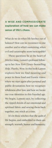 "Lamott’s …most insightful book yet, Stitches offers plenty of her characteristic witty wisdom…this slim, readable volume [is] a lens on life, widening and narrowing, encouraging each reader to reflect on what it is, after all, that really matters."—People