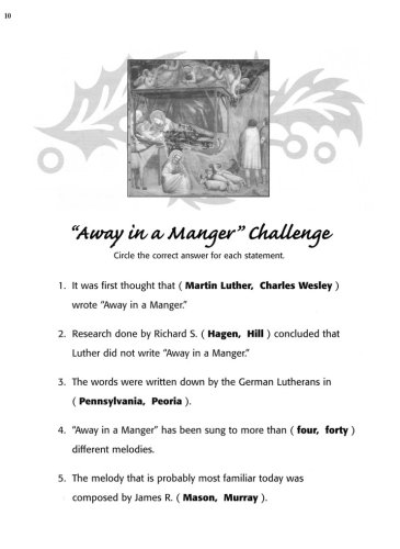 Ten beloved Christmas carols are included in this engaging book, along with historical information about the origins of each carol. This edition contains: an easy-to-read story of the creation of each carol; a simplified arrangement of each carol with text; information on those who wrote the text and the music; plus a fun activity page that reviews the information presented.