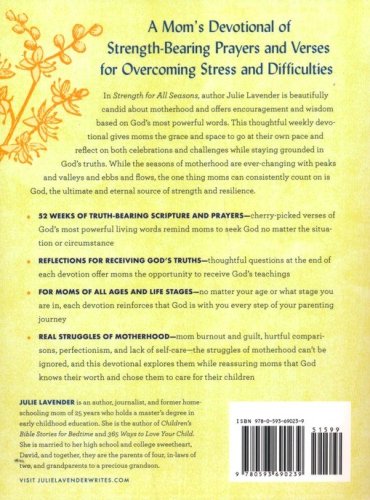In Strength for All Seasons, author Julie Lavender is beautifully candid about the difficulties of motherhood and offers encouragement and wisdom based on God's most powerful words, reminding weary moms that he is the ultimate source of strength and resilience. This thoughtful weekly devotional gives moms the grace and space to go at their own pace and reflect on both celebrations and challenges while staying grounded in God's truths. The seasons of motherhood are ever-changing with peaks and valleys and ebbs and flows, but the one thing moms can consistently count on is God.