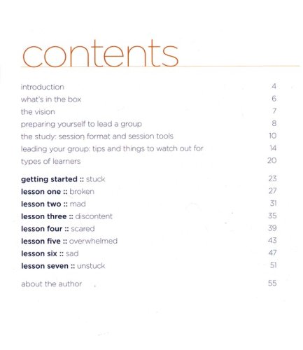 The vision for Stuck Session-by-session helps to guide your group through the study, addressing the needs of the various types of learners in your group.  Walk-through for using each piece of the study: Videos, the personal study projects in the Study Guide, and the Discussion Cards. Helpful tips for leading a group, and much more.