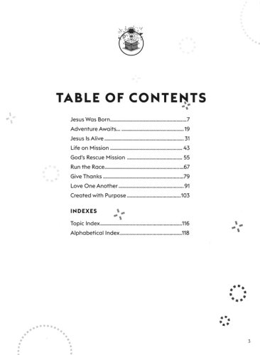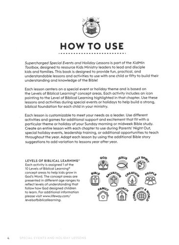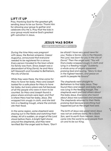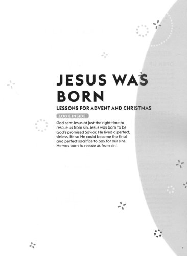 Jesus Was Born: Lessons for Advent and Christmas (Jesus was born.)Adventure Awaits!: Lessons for Adventure Themed Events (Jesus was baptized.)Jesus is Alive: Lessons for Holy Week and Easter (Jesus' Resurrection)Life on Mission: Lessons for Mission-Focused Events (Paul Became a Missionary.)God's Rescue Mission: Lessons for Summer Events (Three Parables – Luke 15)Run the Race: Lessons for Sports-Related Events (The Armor of God)Give Thanks: Lessons for Thanksgiving (A Cheerful Giver)Love One Another: Lessons for Family Holidays (Ruth & Boaz)Created With a Purpose: Lessons for Animal-Themed Events (God Created People.)