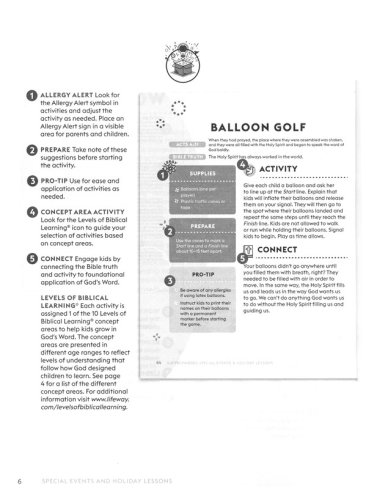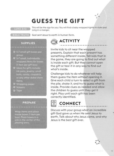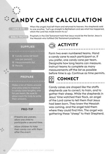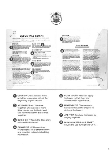 Each section includes on overview of the event with 3 opening activities, 6 lesson activities, a paraphrased Bible story and flow of the schedule. Individual activities are then presented with the Bible truth, a supplies list, activity overview and tips. 120 pages; Softcover; 7.0" x 9.5".