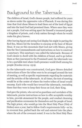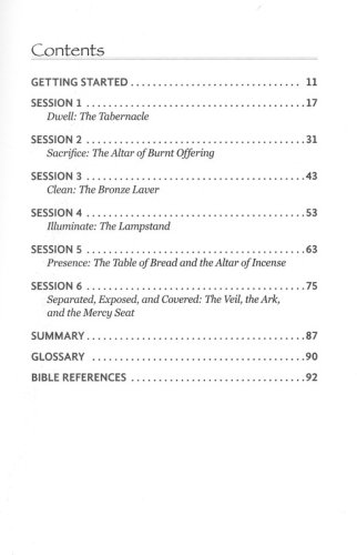 Session 1 Dwell: The Tabernacle Session 2 Sacrifice: The Altar of Burnt Offering Session 3 Clean: The Bronze Laver Session 4 Illuminate: The Lampstand Session 5 Presence: The Table of Bread and the Altar of Incense Session 6 Separated, Exposed, and Covered: The Veil, the Ark, and the Mercy Seat About the Tabernacle Experience®'s life-size replica: