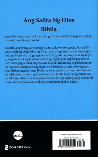 Complete text of the easy-to-read Ang Salita ng Dios translationA plan of salvation article explains how to become a Christian and what it means to follow JesusDictionary of Bible termsTwo-column format8-point type sizeQuality Bible paper