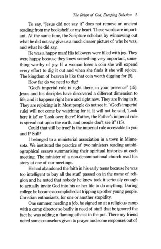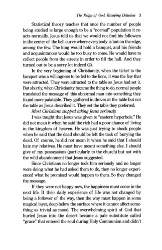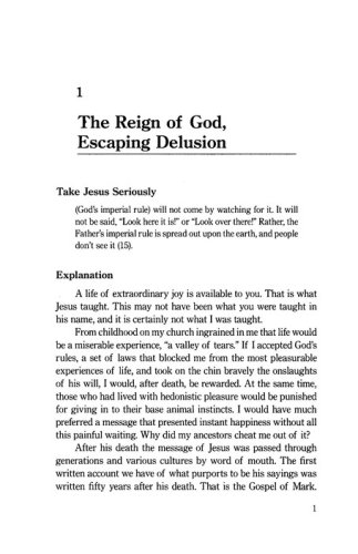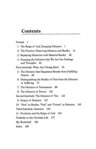 Chapters in Prelude are The Reign of God, Escaping Delusion," *The Practice: Observing Delusion and Reality, – *Replacing Delusions with Material Reality, – and *Escaping the Delusion that We Are Our Feelings and Thoughts. – Chapters in First Interlude: What Am I Doing Here? are *The Delusion that Happiness Results from Fulfilling Desires, – *Distinguishing the Reality of Pain from the Delusion of Suffering, – *The Delusion of Permanence, – and *The Delusion of Person. – Chapters in Second Interlude: The Delusion of Two are *Empty of Delusion, – and *'Now'as Reality, 'Past' and 'Future' as Delusion. – The chapter in Third Interlude: Intention, is *Evolution and the Reign of God. – Also includes Postlude on the Christian Life, My Book Shelf, and an index.