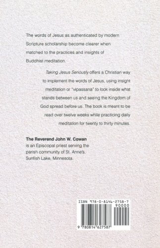 In Taking Jesus Seriously, the words of Jesus become clearer when matched with the practices and insights of Buddhist meditation. This book presents a Christian way to implement the words of Jesus by looking inside to see what stands between the reader and God's kingdom. Cowan connects everyday examples and Jesus' words to the method of Buddhist vipassana or insight meditation by offering instruction, perception, and guidance. With practice, readers can begin to notice what is actual, leave anxiety to the Father, accept pain, and see the world as a child would. This book is designed to be read over twelve weeks while practicing 20 – 30 minutes of daily meditations. Each chapter includes questions and answers.