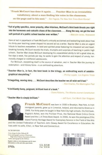Now, here at last is McCourt's long-awaited book about how his thirty-year teaching career shaped his second act as a writer. Teacher Man is also an urgent tribute to teachers everywhere. In bold and spirited prose featuring his irreverent wit and compelling honesty, McCourt records the trials, triumphs and surprises he faced in the classroom. Teacher Man shows McCourt developing his unparalleled ability to tell a great story as, five days a week, five periods per day, he worked to gain the attention and respect of unruly, hormonally charged or indifferent adolescents.