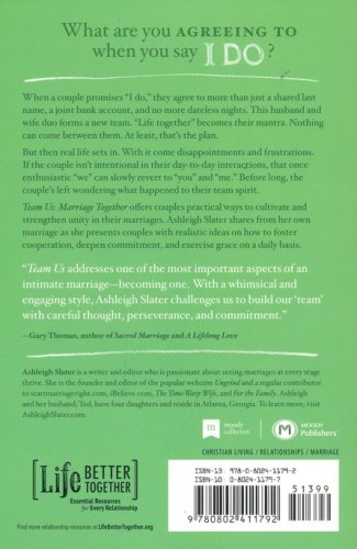 Team Us: Marriage Together offers couples practical ways to cultivate and strengthen unity in their marriages. Author Ashleigh Slater shares from her own marriage as she presents couples with realistic ideas on how to foster cooperation, deepen commitment, and exercise grace on a daily basis.
