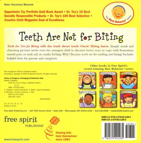 "Crunch crunch crunch. Teeth are strong and sharp. Crunch crunch crunch. Teeth can help you chew. But teeth are not for biting. Ouch! Biting hurts." Sooner or later, almost all young children will bite someone—a friend, a parent, a sibling. This upbeat, colorful, virtually indestructible book helps prevent biting and teaches positive alternatives.