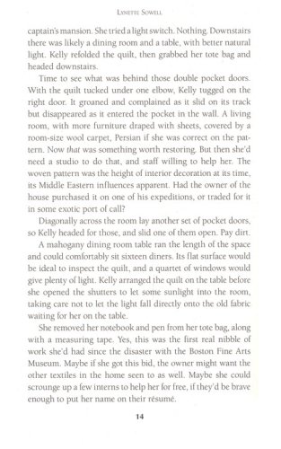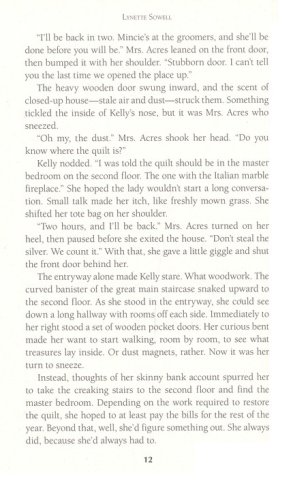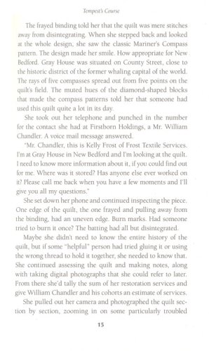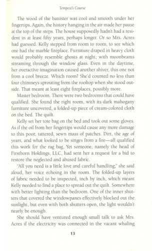 Kelly Frost, a textiles conservator, is invited to the Massachusetts coastal town of Fairhaven to restore the centuries-old Mariner's Compass quilt. But there is one stipulation: she must live and work in Grey House, a former whaling captain's home, where the quilt is stored. There she meets Tom Pereira, the caretaker of Grey House, whose heart seems as hard as the rocky Massachusetts coastline. Over the long-lit months as Kelly works to restore the quilt, she is buoyed by occasional afternoon visits from Tom and other Fairhaven town members, and is drawn into their lives. And each night, as she reads stories in a daily journal penned by Mary Grey, she learns details about her newfound community members that help her see that their lives are as vivid and interwoven as the quilt pieces she is working to restore. But, when Kelly discovers a truth about Tom’s heritage hidden in the journal, she must decide if keeping the past to herself is the only way to ensure the hope of a future with Tom.