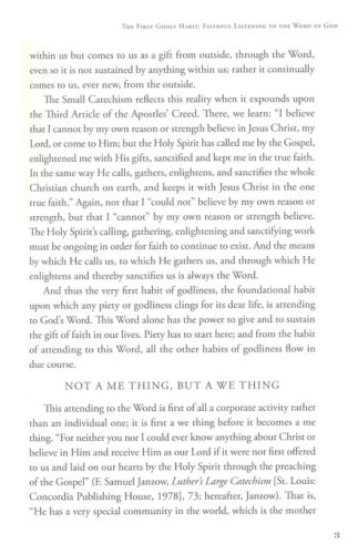 Piety is simply the cultivation of godly habits–habits that befit the household of God, the family of our heavenly Father. It grows from Baptism, grounded in the gracious adoption that God bestows on us with water and the name of the blessed Trinity. These habits mark how we, as children of the heavenly Father, live in this world as we wait for our Lord's return.