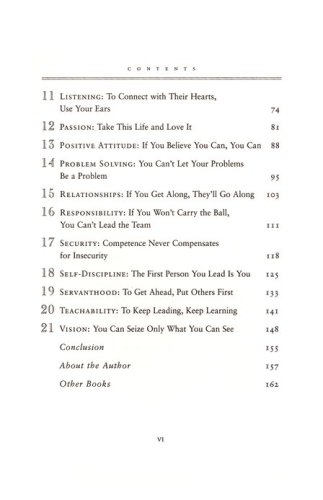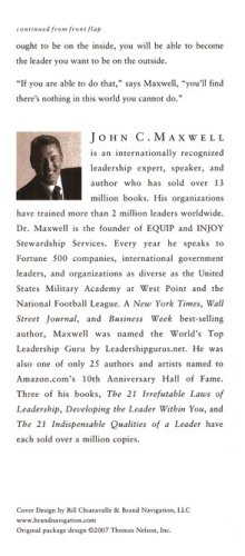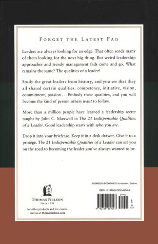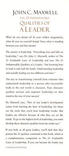 “The 21 Indispensable Qualities of a Leader gets straight tothe heart of leadership issues. Maxwell once again touches on the process ofdeveloping the art of leadership by giving the reader practical tools andinsights into developing the qualities found in great leaders.” – KennethBlanchard, Coauthor of The One MinuteManager®