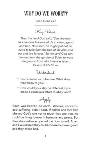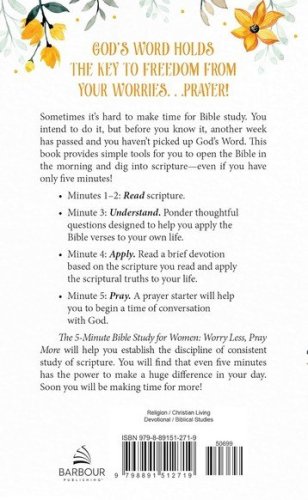 Minutes 1–2: Read scripture.Minute 3: Understand. Ponder thoughtful questions designed to help you apply the Bible verses to your own life.Minute 4: Apply. Read a brief devotional based on the scripture you read.Minute 5: Pray. A prayer starter will help you to begin a time of conversation with God.The 5-Minute Bible Study for Women: Worry Less, Pray More will help you establish the discipline of consistent study of scripture. You will find that even five minutes focused on scripture and prayer has the power to make a huge difference in your day. Soon you will be making time for more!