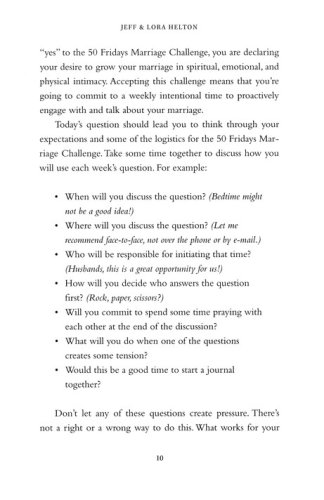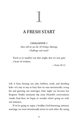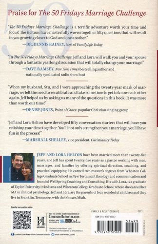 By taking the 50 Fridays Marriage Challenge, husbands and wives will find that their Friday evening talks—whether they laugh together, delve deep into the topic at hand, or plan and dream for the future—may be the only time they spend in close conversation that doesn’t involve the kids, the checking account, or who took out the trash. Spend a few precious moments together once a week with this book, and you will ultimately see your marriage transformed.