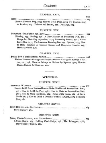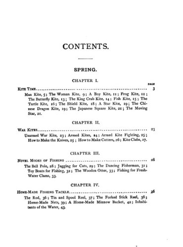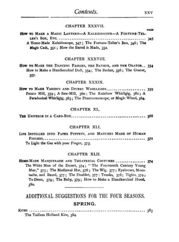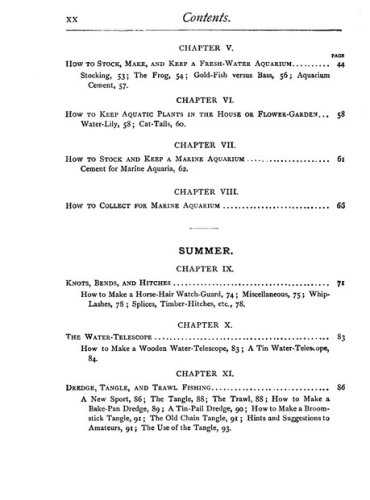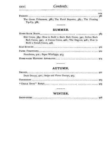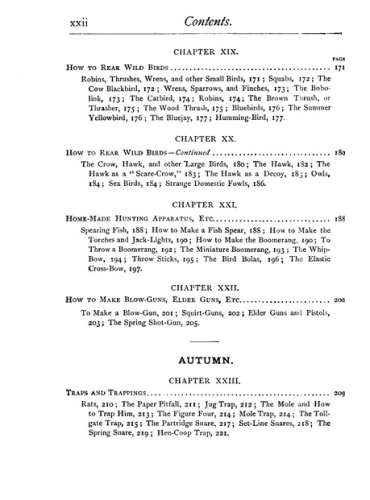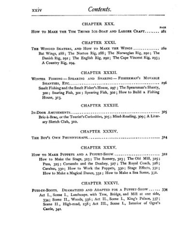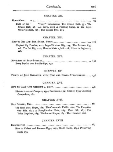 This book was the perfect survival manual. It contained plans for 16 kinds of kites and hot-air ballons and fishing tackle. It told you how to make and stock an aquarium, to construct a water telescope and how to camp out without a tent. Or in a hut made from pine boughs. How to build 10 kinds of boats, including a flatboat with a covered cabin. Iceboats, too. One-person canoes. Bird calls. Squirt guns with astonishing range and authority.