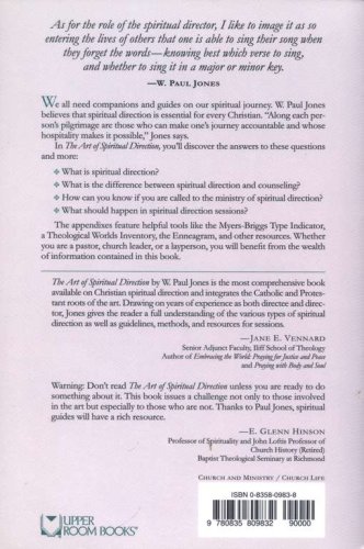 This comprehensive manual employs case studies. The book includes appendixes that include Group Consensus Discernment, Myers-Briggs usages, the Enneagram, TDF Inventory, Family Systems, and the Jo-Hari Window. Jones's approach makes this book an exceptional textbook for colleges and seminaries as well as for those who seek understanding of spiritual direction.