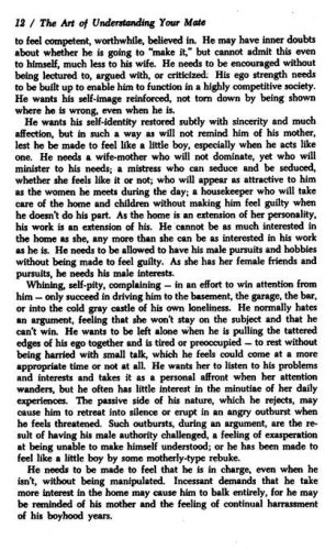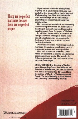 If you've ever wondered exactly what is going on in your mate's mind, you can probably find it somewhere in the pages of The Art of Understanding Your Mate. Cecil Osborne casts a clinical eye on the underlying psychological forces that drive married relationships. His common-sense outlook on counseling troubled couples is based on a solid understanding of human behavior. Illuminating insights tumble from the pages of his book. In addition, Osborne has a keen ear for the spoken word. Through a liberal injection of actual dialogue, he captures the feelings of drama and tensions between husband and wife. Osborne advocates a realistic approach to marriage. He cautions couples to expect to encounter problems of incompatibility. Men and women are different. Their needs are different, as are the emotions that accompany those needs. The wonder is, Osborne points out, that there are so many successful marriages.