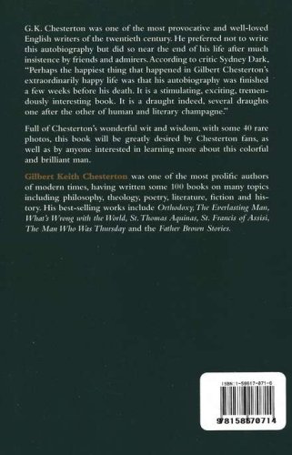 Here is a special two-in-one book that is both by G.K. Chesterton and about Chesterton. This volume offers an irresistible opportunity to see who this remarkable man really was. Chesterton was one of the most stimulating and well-loved writers of the 20th century. His 100 books, and hundreds of essasy and columns on a great variety of themes have made G.K. Chesterton the most widely quoted writers of modern times. Here is Chesterton is his own words, in a book he preferred not to write, but did so near the end of his life after much insistence by friends and admirers. Critic Syndey Dark wrote after Chesterton died that perhaps the happiest thing that happened in Gilbert Chesterton's extraordinarily happy life was that his autobiography was finished a few weeks before his death. It is a stimulating, exciting, tremendously intresting book. It is a draught – indeed, several draugts one after the other – of human and literary champagne." Full of Chesteron's wonderful and unique writing, humor, inspiration and humilty, with some 40 rare photos, this book will be greatly desired by Chesterton fans, as well as by anyone interested in learning who this colorful and brilliant persons was.