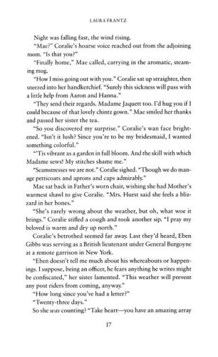 As Mae's friendship grows with the American general Rhys Harlow, Coralie continues her liaison with her childhood sweetheart, a British officer stationed in New York. Mae, torn between her deepening love for the general and suspicion that her sister is a British spy, leaves the only home she's ever known for the New York frontier. When betrayal strikes in the heart of the wilderness, she's forced to take a perilous journey that tests her very survival and those she loves, all in the name of liberty.
