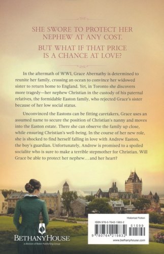 In the aftermath of WWI, Grace Abernathy is determined to reunite with her family, crossing an ocean to convince her widowed sister to return home to England. Yet Toronto holds more tragedy and her nephew Christian is now in the custody of his paternal relatives, the formidable Easton family, who rejected Grace's sister because of her low social status. Unconvinced the Eastons can be fitting caretakers, Grace jumps at the chance to be Christian's nanny and observe the family up close under an assumed name. In the course of her new position, she is shocked to discover herself falling for Andrew Easton, the boy's guardian. Unfortunately, Andrew is promised to a spoiled socialite who will make a terrible stepmother for Christian. Will Grace be able to protect her nephew and her heart?