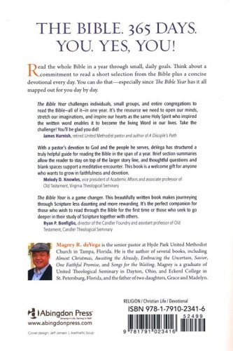 The Bible. 365 days. You. Yes, you! Not the type to sit down and read the entire Bible? Yes, the goal is to read the whole Bible in a year, but think about it in terms of smaller, daily goals. Think about a commitment to read a short selection from the Bible plus a concise devotional every day. You can do that – especially since The Bible Year has it all mapped out for you day by day. Plus, you’ll also get summaries of key themes and ideas to help you better digest and understand your readings. So you’re not just reading verse after verse, you’re enriching your spiritual life, developing a deeper faith and forming a closer connection to God and to each other. The Bible Year is also a wonderful way for small groups or even individuals to grow closer to God, while providing a common thread that will promote new and deeper friendships among members. Additional resources sold separately include a Leader Guide with discussion questions for small groups and a Pastor's Guide for a church-wide emphasis. Daily Bible goals start here! Praise for The Bible Year When it comes to read-through-the-Bible-in-a-year programs, The Bible Year is a game changer. Packed with devotionals, discussion guides, and resources for pastors, this beautifully written book makes journeying through Scripture less daunting and more rewarding. It’s the perfect companion for those who wish to read through the Bible for the first time or those seek to go deeper in their study of Scripture together with others. – Ryan P. Bonfiglio, Director of the Candler Foundry and Assistant Professor of Old Testament, Candler Theological Seminary With a pastor’s devotion to God and the people he serves, deVega has structured a truly helpful guide for reading the Bible in the span of a year. The thoughtful format is well designed to encourage steady progress in reading, and provoke thoughtful reflection. Brief section summaries allow the reader to stay on top of the larger story line, and thoughtful questions and blank spaces support a meditative encounter. This book is a welcome gift for anyone who wants to grow in faithfulness and devotion. – Melody D. Knowles, Vice President of Academic Affairs and Associate Professor of Old Testament, Virginia Theological Seminary