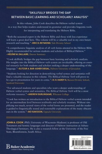 Cook has spent a quarter of a century working on the Biblical Hebrew verbal system. Building on and simplifying the author's much-discussed technical work, this book offers an accessible linguistic treatment of the Biblical Hebrew verb in all its facets. Cook illustrates his analysis with over two hundred fifty example passages and gives references to additional similar passages. The examples range from individual clauses and verses to longer portions in order to show how verbs interact with each other in larger stretches of text. A glossary of linguistic terms further facilitates understanding of the book's linguistic analysis.
