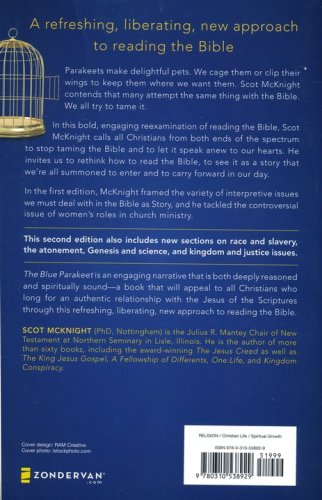 Parakeets make delightful pets. We cage them or clip their wings to keep them where we want them. Scot McKnight contends that many, conservatives and liberals alike, attempt the same thing with the Bible. We all try to tame it. McKnight's The Blue Parakeet calls Christians to stop taming the Bible and to let it speak anew to our heart.