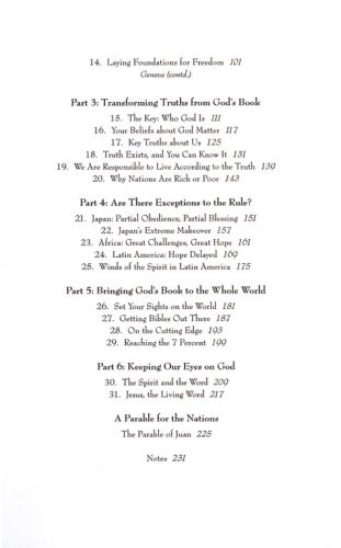 The Word of God is a supernatural thing, with the power of God directing its course throughout time. It has transformed lives, cultures, and the world, and it still does in both large and small ways. Loren Cunningham and his book keep this in mind when addressing the role and impact that the Bible has. The book is broken into six sections to discuss separate aspects of the transformative effect, offering tales from many nations, some of the truths of Scripture, and retaining a God-ward focus, among other things. When a culture is exposed to the Gospel of Jesus Christ two things happen; it is transformed to its core, and those who introduce the Good News align themselves with the will of God.