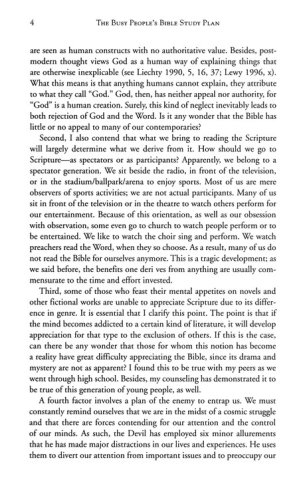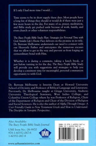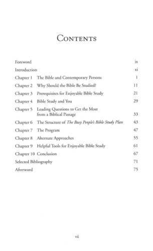 Time seems to be in short supply these days. For many of us, prayer, meditation, and Bible study get pushed aside because of work, family, and church responsibilities. The Busy People Bible Study provides you with suggestions and strategies to help you develop a consistent time for meaningful, personal communion with God.