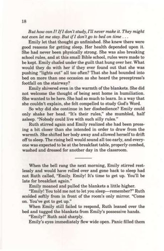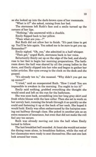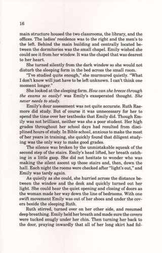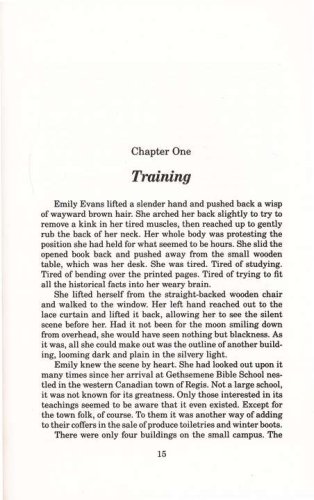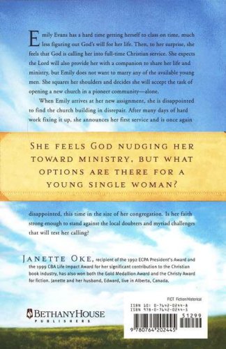 Emily Evans has a hard time getting herself to class on time, much less figuring out God's will for her life. Then, to her surprise, she feels that God is calling her into full-time Christian service. She expects the Lord will also provide her with a companion to share her life and ministry, but Emily does not want to marry any of the available young men. She squares her shoulders and decides she will accept the task of opening a new church in a pioneer community–alone.